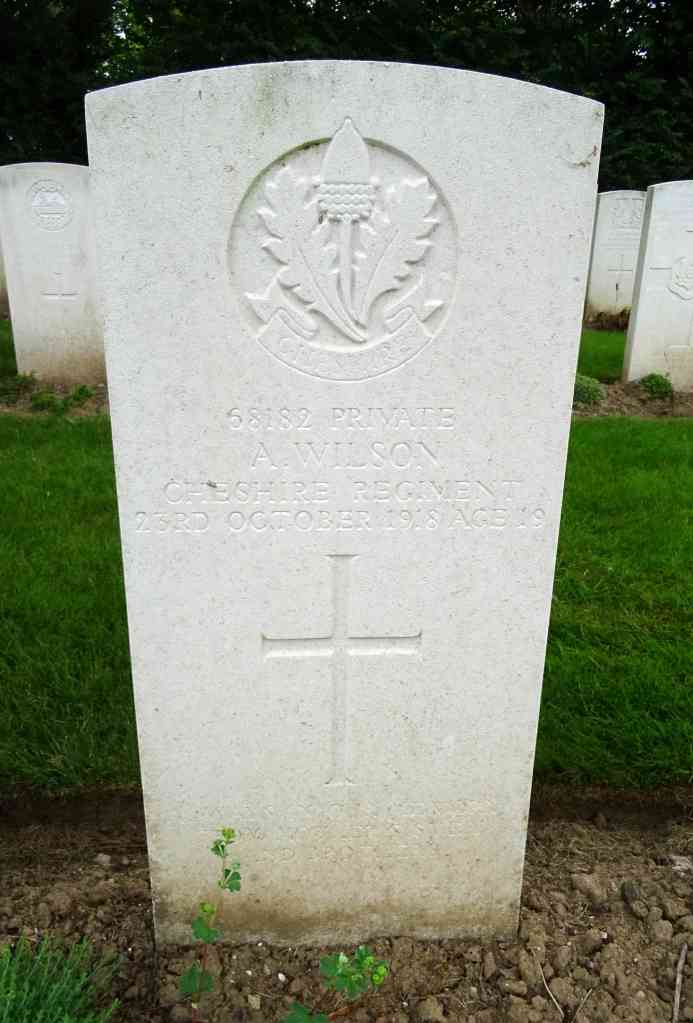 23/10/1918 Private Ernest Whitby (Age 22) 1st Bn. Amerval Communal Cemetery Extension, Solesmes, Nord France. ‘68253’ Son of Alfred and Miriam Carter Whitby, of 17, Jackson Lane, Runcorn, Cheshire. (pic from findagrave.com – with thanks)
