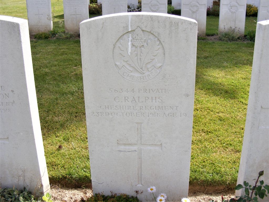 23/10/1918 Private Charlie Ralphs (Age 19) 1st Bn. Romeries Communal Cemetery Extension, Nord France. ‘53644’ Son of Charles and Ellen Ralphs, of Tallam Green, Malpas, Cheshire. (pic from findagrave.com – with thanks)