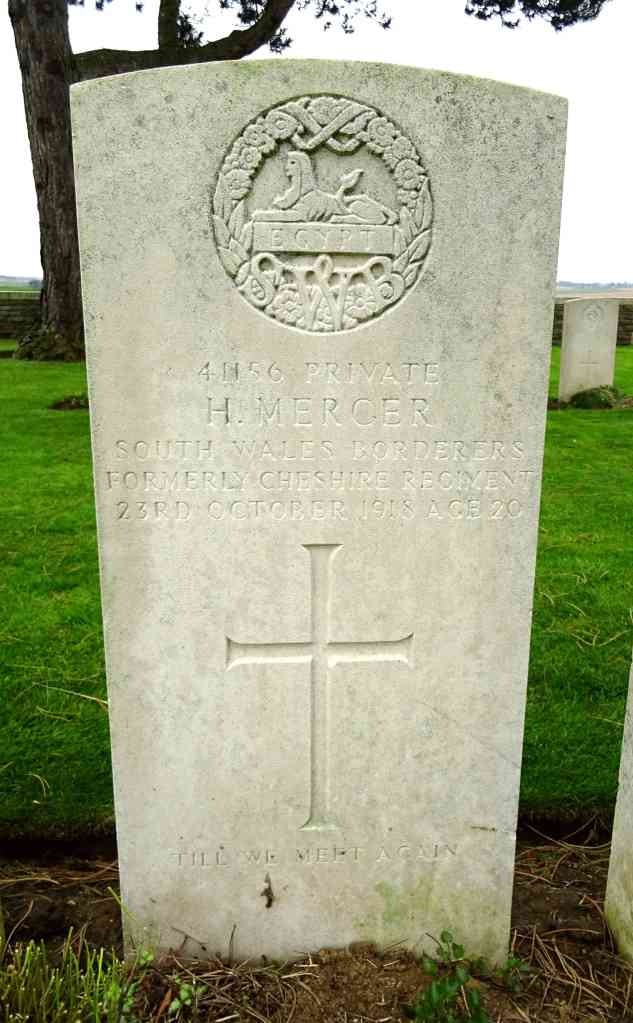 23/10/1918 Private Herbert Mercer (Age 20) 41156 Attached to SWB 1st Bn. Highland Cemetery, Le Cateau, Nord, France. (pic from findagrave.com – with thanks)