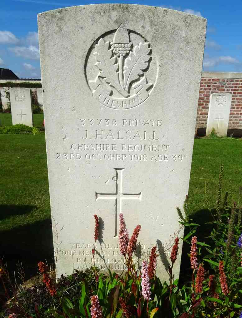 23/10/1918 Private James Halsall 1st Bn. Belle Vue British Cemetery, Briastre, Nord France. ‘33738’ Son of William and Jane Halsall, of Foxdale, Isle of Man; husband of Gertrude Halsall, of 97, Armitage St., Ardwick, Manchester. (pic from findagrave.com – with thanks)