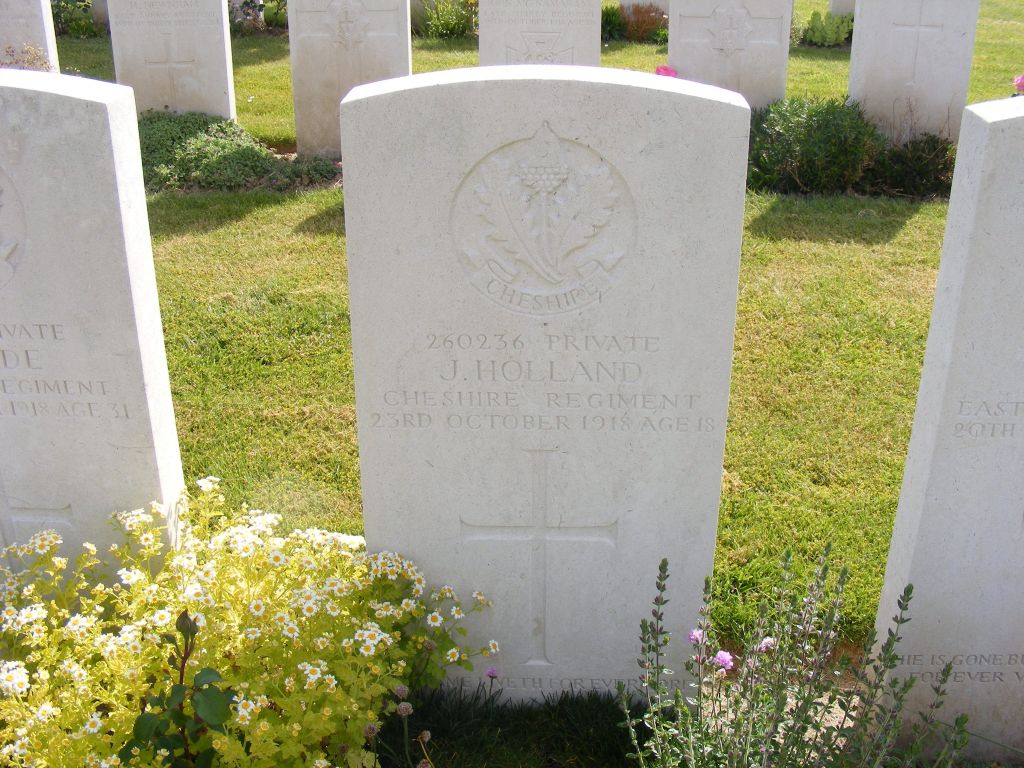 23/10/1918 Private John Holland (Age 18) 1st Bn. Romeries Communal Cemetery Extension, Nord France. ‘260236’ Son of Mr. H. and Mrs. M. Whittaker, of 33, Holmfield Rd., Blackpool. (pic from findagrave.com – with thanks)