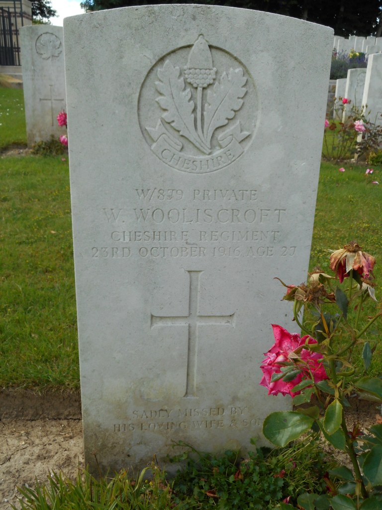 23/10/1916 Private William Wooliscroft (Age 27) 13th Bn. Contay British Cemetery, Contay, Somme France. ‘W/879’ Son of William and Annie Wooliscroft, of Birkenhead; husband of E. Wooliscroft, of 10, York Place, Pokesdown, Bournemouth. (pic from findagrave.com – with thanks)