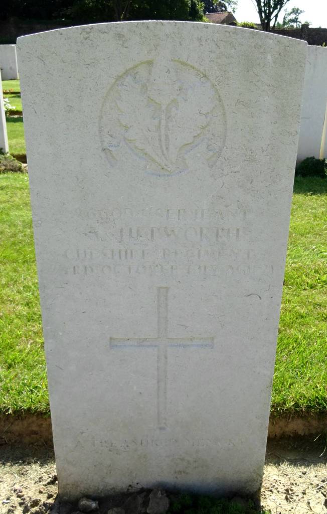 23/10/1917 Serjeant Albert Hepworth (Age 21) 11th Bn Cambrin Military Cemetery, Pas de Calais France. ‘266094’ Son of Mr. J. and Mrs. F. Hepworth, of 231, George Lane, Bredbury, Stockport. (pic from findagrave.com – with thanks)
