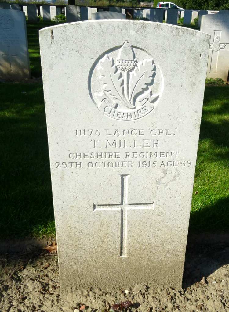 29/10/1915 Lance Corporal Thomas Miller (Age 39) 9th Bn. Le Touret Military Cemetery, Richebourg-L’avoue, Pas de Calais France. ‘11176’ Son of John Miller, of 5, Nith St., Dumfries. (pic from findagrave.com – with thanks)