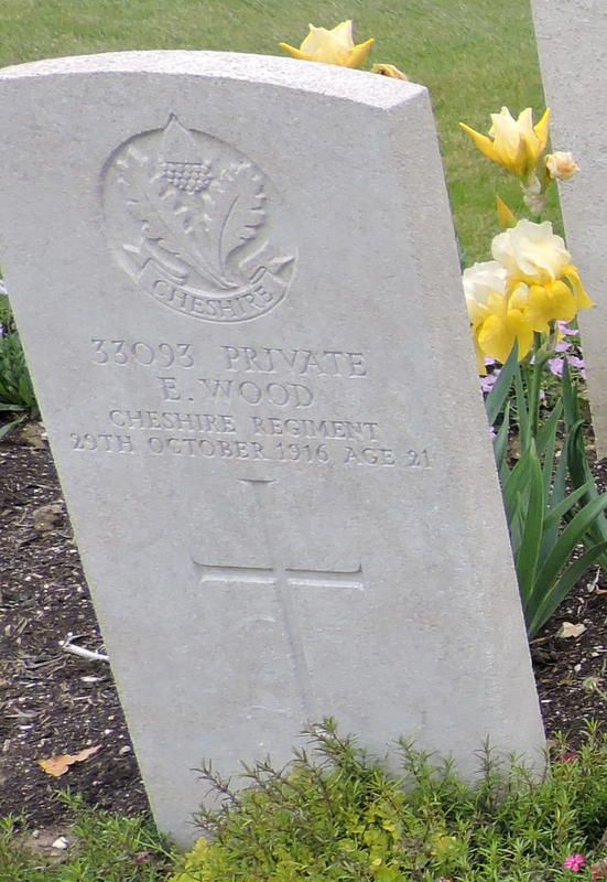 29/10/1916 Private Ernest Wood (Age 21) 13th Bn. St. Sever Cemetery Extension, Rouen, Seine-Maritime France. ‘33093’ Son of Joseph and Betsy Wood, of 12, Burkett St., Hyde, Cheshire. (pic from findagrave.com – with thanks)