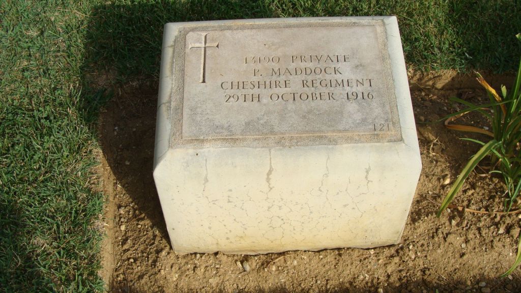 29/10/1916 Private Peter Maddock 12th Bn. Karasouli Military Cemetery, Greece. ‘13190’ (pic from findagrave.com – with thanks)