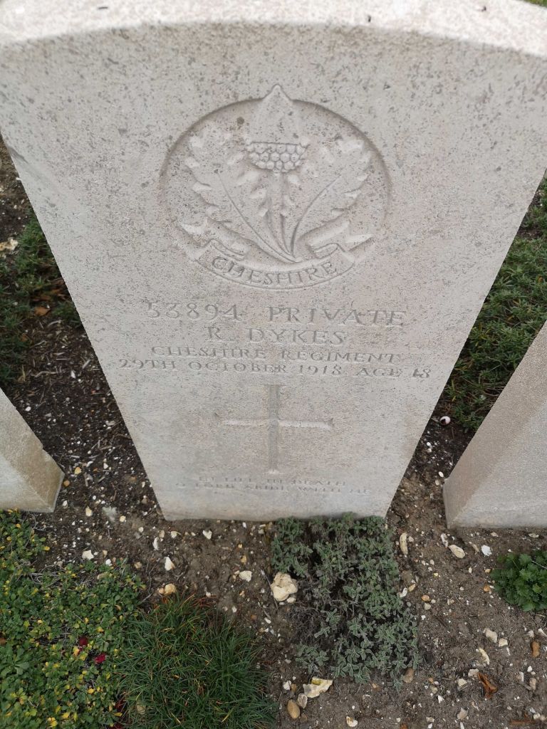 29/10/1918 Private Reginald Dykes (Age 18) 1st Bn. St. Sever Cemetery Extension, Rouen, Seine-Maritime France. ‘53894’ Son of George Henry and Ellen Dykes, of 10, Ridgway St., Crewe, Cheshire. (pic from findagrave.com – with thanks)