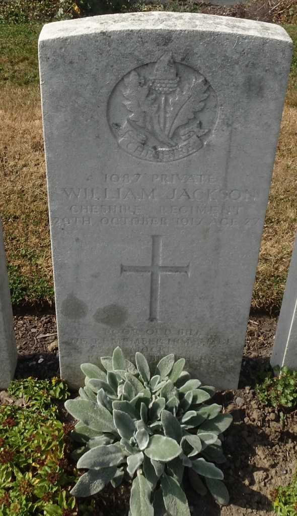 29/10/1917 Private William Jackson (Age 27) 16th Bn. Mendinghem Military Cemetery, West-Vlaanderen Belgium. ‘1087’ Son of Isaac and Jane Jackson, of 5, Borough Rd., Birkenhead. Born at Rock Ferry, Birkenhead.
