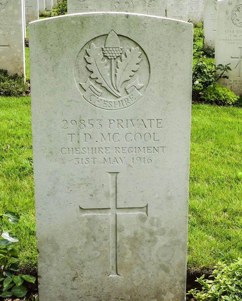 31/05/1916 Private Thomas David McCool 10th Bn. Ecoivres Military Cemetery, Mont-St. Eloi, Pas de Calais France. ‘29853’ (pic from findagrave.com – with thanks)
