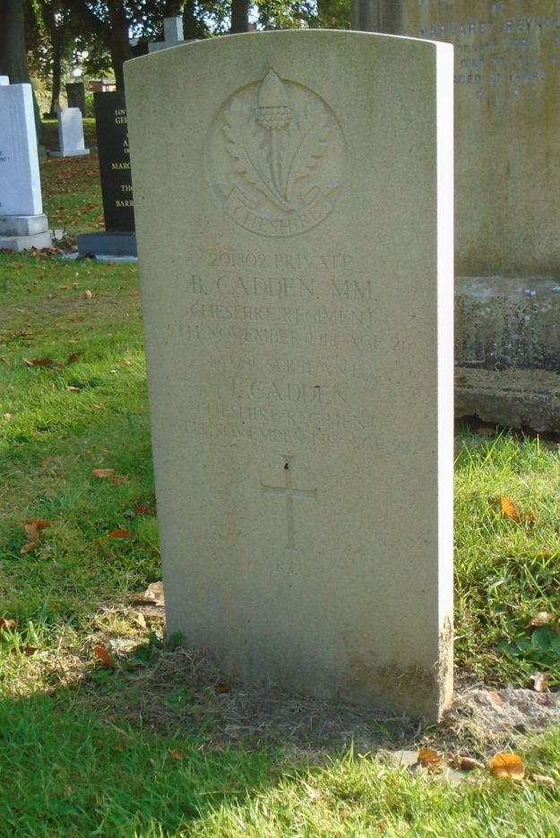 5/11/1918 Private Bernard Cadden (Age 26) MM 2nd/4th Bn. Wallasey (Rake Lane) Cemetery, Cheshire United Kingdom. ‘201802’ Son of Bernard and Margaret Cadden, of 30, Poulton Rd., Wallasey. His brother J Cadden also fell. (pic from findagrave.com – with thanks)