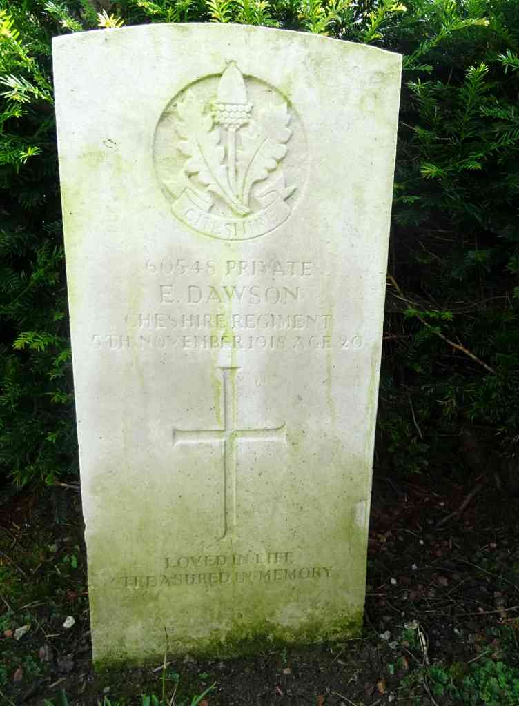 5/11/1918 Private Edward Dawson (Age 20) 1st Bn. Pont-Sur-Sambre Communal Cemetery, Nord France. ‘60548’ Son of Charles and Alice Hannah Dawson, of Barlow Bottoms, Shawforth. Rochdale. (pic from findagrave.com – with thanks)