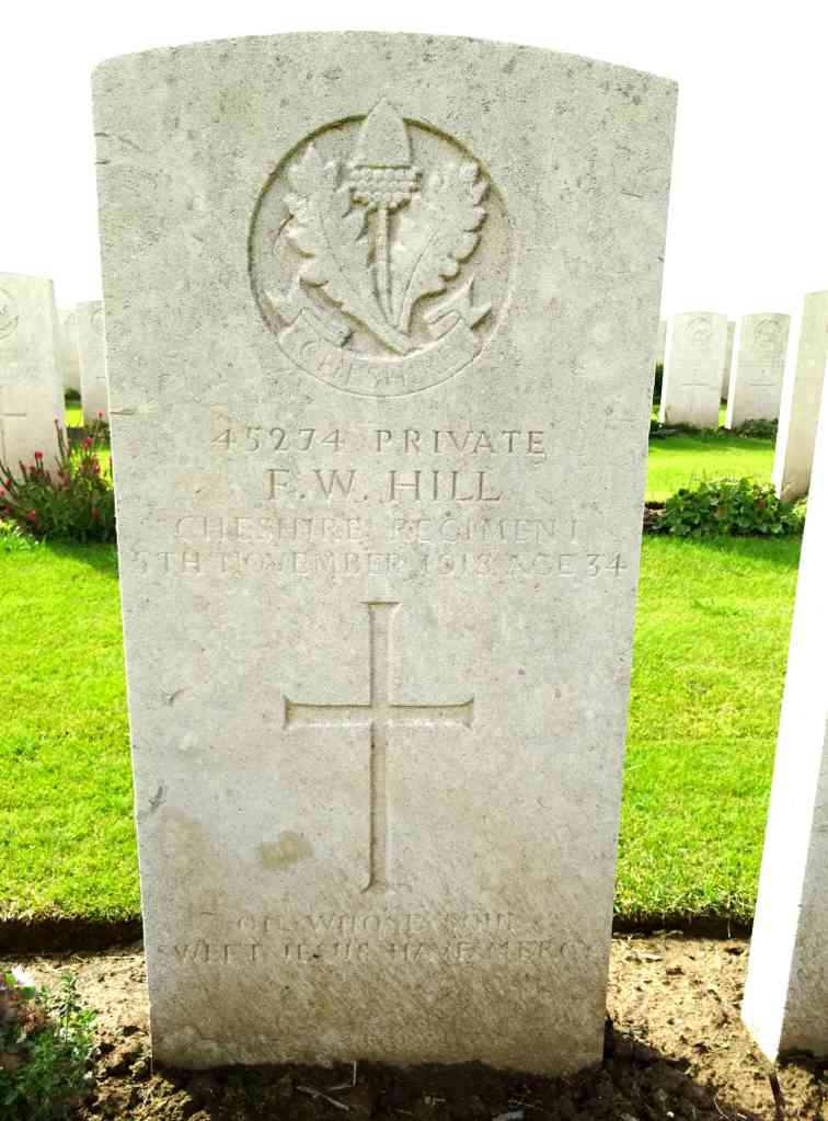 5/11/1918 Private Fredrick Watson Hill (Age 34) 9th Bn. Canonne Farm British Cemetery, Sommaing, Nord France. ‘45274’ Son of Mary Hill, of 35, Wightman St., Cottenham St., Liverpool, and the late George Watson Hill. Born at Liverpool. (pic from findagrave.com – with thanks)