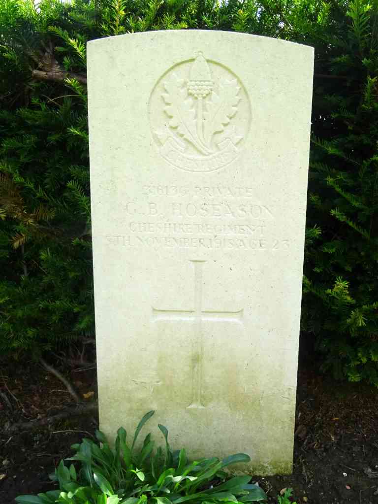 5/11/1918 Private Gilbert Bruce Hoseason (Age 23) 1st Bn. Pont-Sur-Sambre Communal Cemetery, Nord France. ‘316136’ Son of Mrs. Caroline Hoseason, of 59, Lansdowne Rd., West Didsbury, Manchester. (pic from findagrave.com – with thanks)