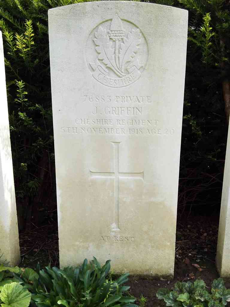 5/11/1918 Private James Griffin (Age 20) 1st Bn. Pont-Sur-Sambre Communal Cemetery, Nord France. ‘76883’ Son of Alexander and Esther Griffin, of 17, Dialstone Lane, Stockport. (pic from findagrave.com – with thanks)