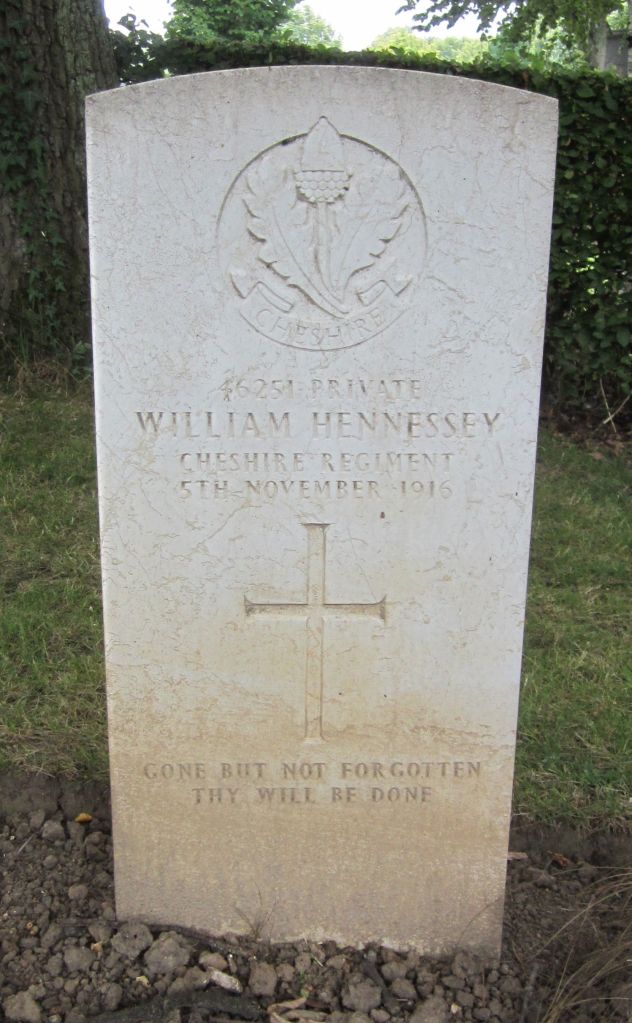 5/11/1916 Private William Hennessey (Age 26) 17th Labour Bn. Ste. Marie Cemetery, Le Havre, Seine-Maritime France. ‘46251’ Son of Susannah Hennessey, of 15, Minden St., Blackburn, and the late Mr. Hennessey. (pic from findagrave.com – with thanks)