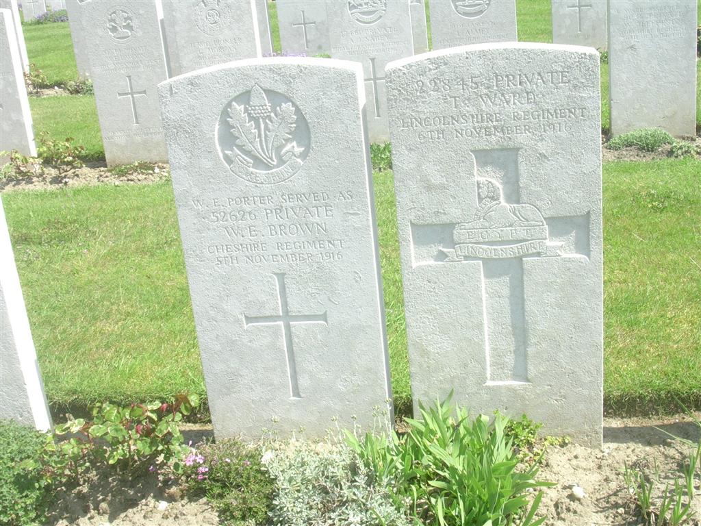 5/11/1916 Private William Edward Porter [Brown] (Age 34) 11th Bn. Etaples Military Cemetery, Pas de Calais France. ‘52626’ (served as BROWN). Son of the late John Prior Porter and Maria Porter. (pic from findagrave.com – with thanks)