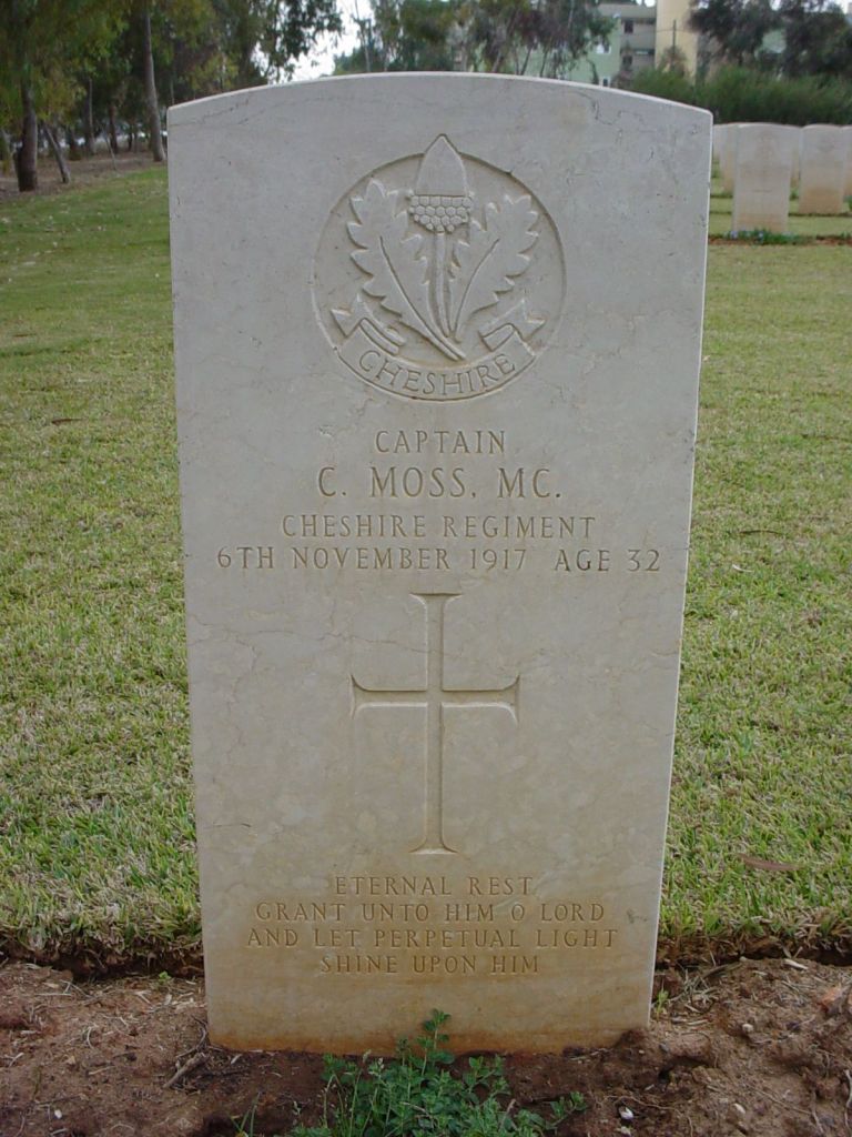 6/11/1917 Captain Charles Moss (Age 32) MC 1st/7th Bn. Beersheba War Cemetery, Israel and Palestine (including Gaza). Son of Charles Moss, of 21, Bread St., Cheapside, London. (pic from findagrave.com – with thanks)