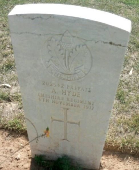 6/11/1917 Private Alfred Hyde 1st/4th Bn. Beersheba War Cemetery, Israel and Palestine (including Gaza). ‘202542’ (pic from findagrave.com – with thanks)