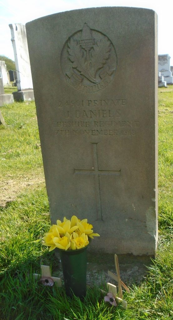 7/11/1918 Private Joseph Daniels 6th Bn. Wallasey (Rake Lane) Cemetery, Cheshire United Kingdom. ‘24501’ Husband of Jane Daniels, of 39, Guildford St., Egremont, Wallasey. (pic from findagrave.com – with thanks)