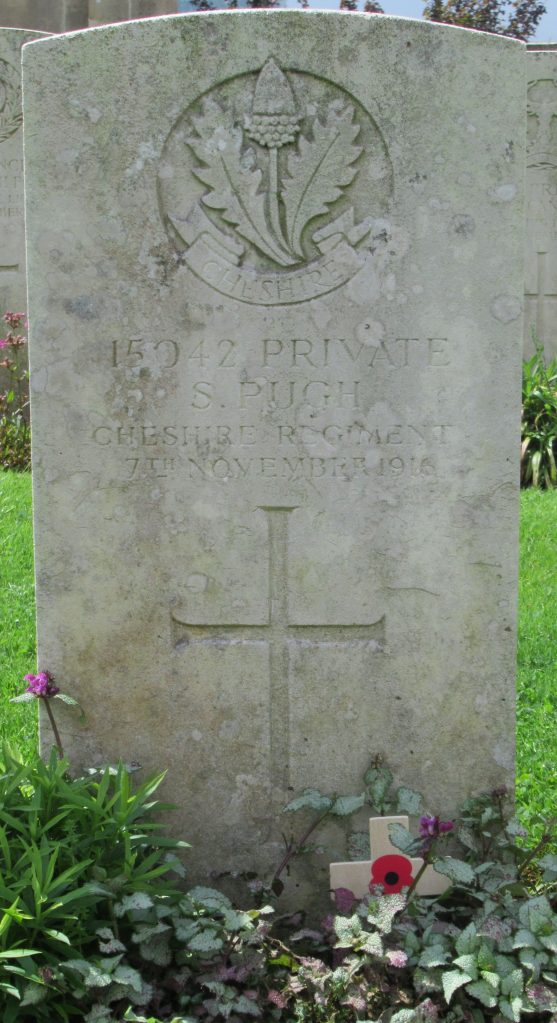 7/11/1916 Private Samuel Pugh (Age 20) 6th Bn. Puchevillers British Cemetery, Somme France. ‘15042’ Son of Mary Jones of 11, St. Austin’s Court, Shrewsbury, Salop. (pic from findagrave.com – with thanks)