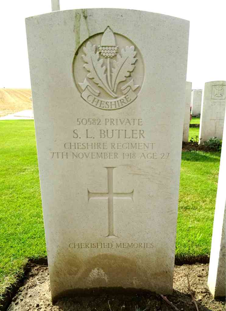 7/11/1918 Private Samuel Leonard Butler (Age 27) 9th Bn. Canonne Farm British Cemetery, Sommaing, Nord France. ‘50582’ Son of Mr. and Mrs. Samuel Butler, of 23, Harrison Rd., Leicester; husband of Beatrice Ellen Butler, of 4, Walnut St., Leicester. (pic from findagrave.com – with thanks)
