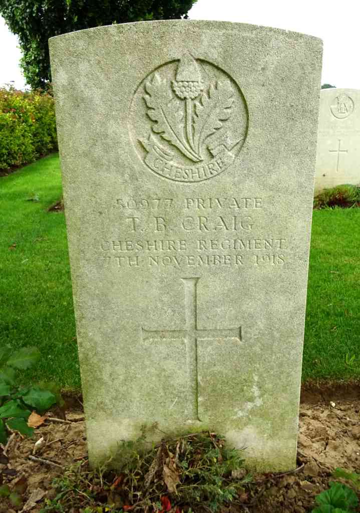 7/11/1918 Private Thomas Brown Craig 9th Bn. Cross Roads Cemetery, Fontaine-Au-Bois, Nord France. ‘50977’ (pic from findagrave.com – with thanks)