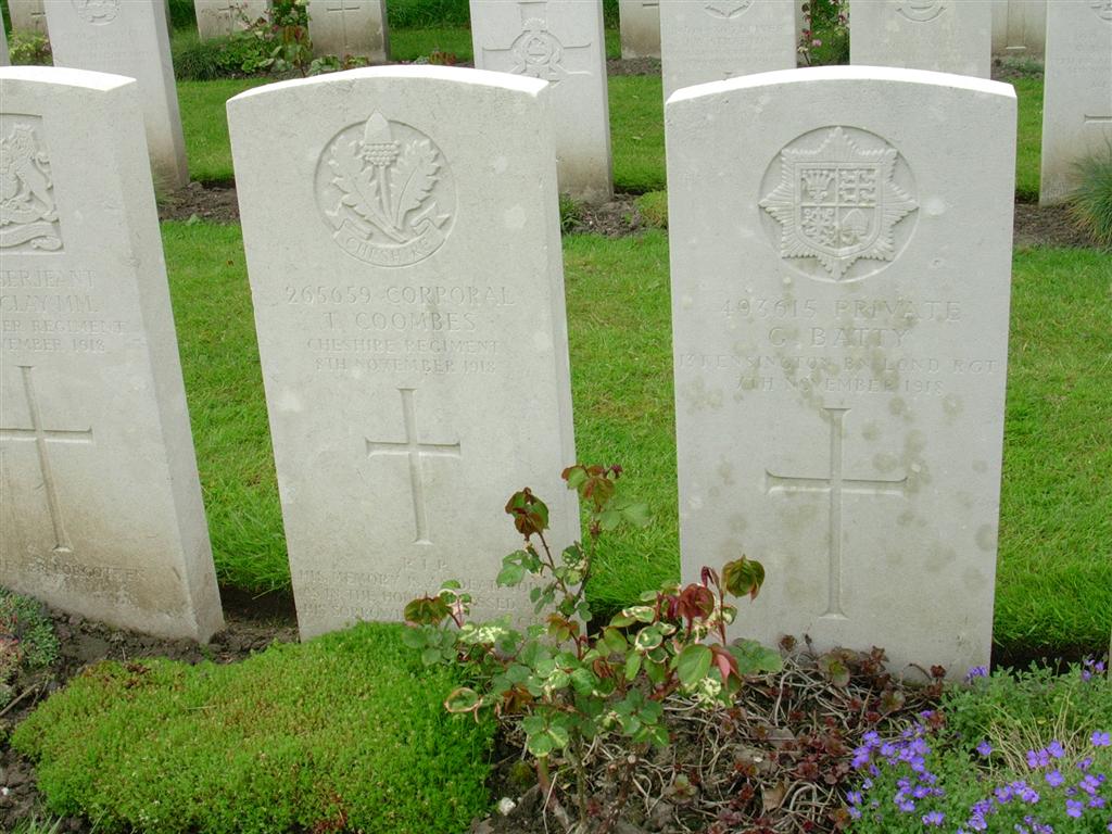 8/11/1918 Corporal Thomas Coombes (Age 33) 9th Bn. Etaples Military Cemetery, Pas de Calais France. ‘265659’ Husband of Mrs. M. L. M. Coombes, of 8, Ernest St., Cheadle, Cheshire. (pic from findagrave.com – with thanks)