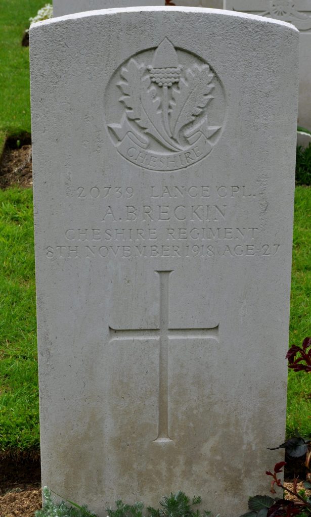 8/11/1918 Lance Corporal Alfred Breckin (Age 27) 9th Bn. Tourgeville Military Cemetery, Calvados France. ‘20739’ Son of Alfred and Isabella Breckin, of 11, Primrose Lane, Burton Rd., Leeds. (pic from findagrave.com – with thanks)