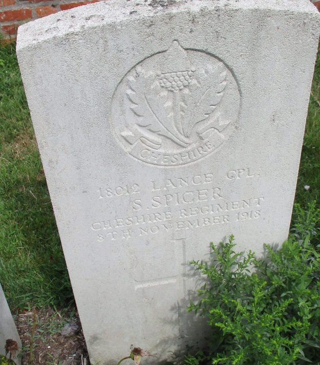 8/11/1918 Lance Corporal Sydney Spicer 1st/6th Bn. Y Farm Military Cemetery, Bois-Grenier, Nord France. ‘18012’ (pic from findagrave.com – with thanks)