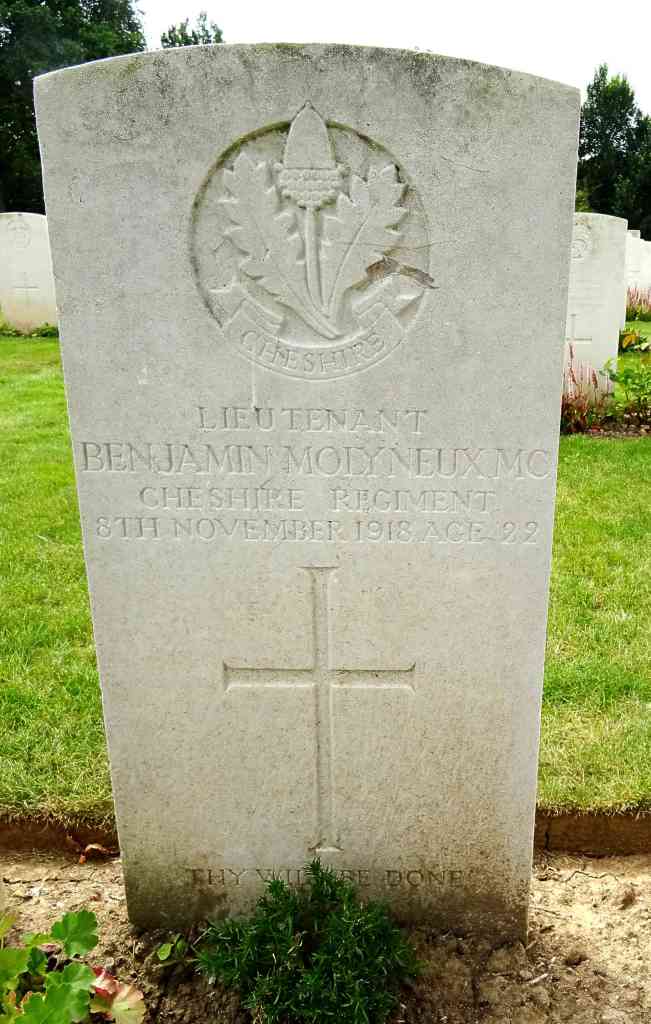 8/11/1918 Lieutenant Benjamin Molyneux (Age 22) MC 3rd Bn. attd. 9th Bn. Awoingt British Cemetery, Nord France. Son of Daniel Webster Molyneux and Amelia Margaretta Molyneux, of Liverpool. (pic from findagrave.com – with thanks)