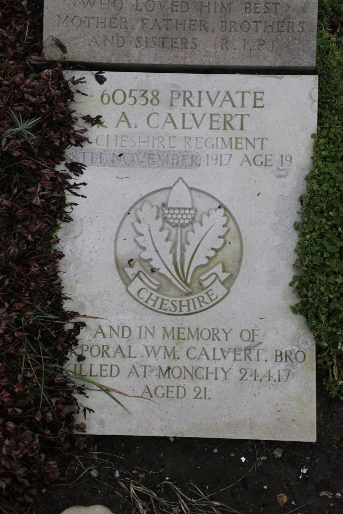 8/11/1917 Private Arthur Calvert (Age 19) 1st Bn. Wimereux Communal Cemetery, Pas de Calais France. ‘60538’ Son of James Walter and Emma Calvert, of Bolton, Lancs. (pic from findagrave.com – with thanks)