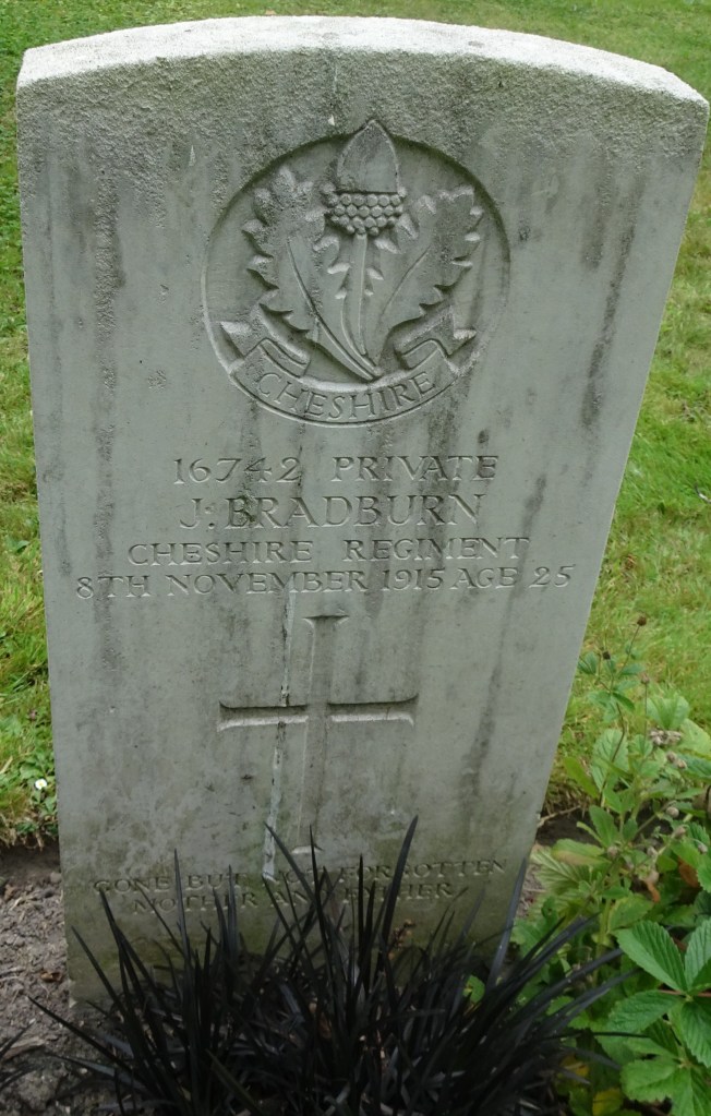 8/11/1915 Private Josiah Bradburn (Age 25) 11th Bn. Rifle House Cemetery, Hainaut Belgium. ‘16742’ Son of Anthony and Mary Jane Bradburn, of 76, Market St., Denton, Manchester.