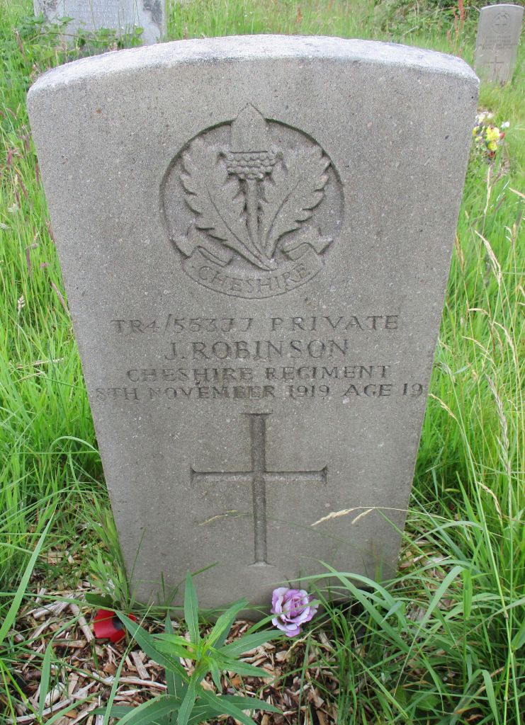 8/11/1919 Private John Robinson (Age 19) 53rd Bn. Blackburn Cemetery, Lancashire United Kingdom. ‘TR4/55377’ Son of Mrs. Jane Robinson, of Dockyard, Eden St., Blackburn. (pic from findagrave.com – with thanks)