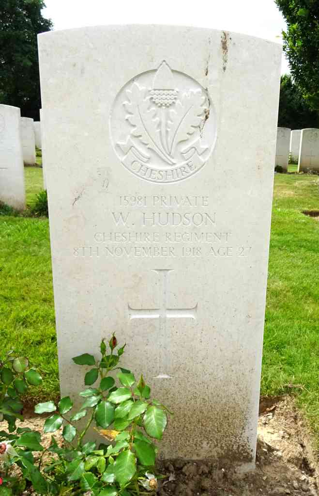8/11/1918 Private William Hudson (Age 27) 9th Bn. Awoingt British Cemetery, Nord France. ‘15981’ Son of Edward and Ann Hudson, of The Post Office, Ilam, Ashbourne, Derbyshire. Native of Leek Moorside, Leek, Staffs. (pic from findagrave.com – with thanks)