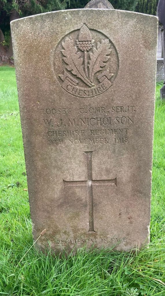 9/11/1918 Company Quartermaster Serjeant William John Michael Nicholson 4th Bn. Bebington Cemetery, Cheshire United Kingdom. ‘200536’ Son of William and Helen Nicholson, of 9, Allcot Avenue, Birkenhead. (pic from findagrave.com – with thanks)