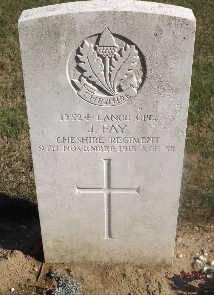 9/11/1915 Lance Corporal James Fay (Age 38) 1st Bn. Citadel New Military Cemetery, Fricourt, Somme France. ‘12524’ Son of the late Francis and Elizabeth Fay, of 70, Campaina St., Garston, Liverpool. (pic from findagrave.com – with thanks)