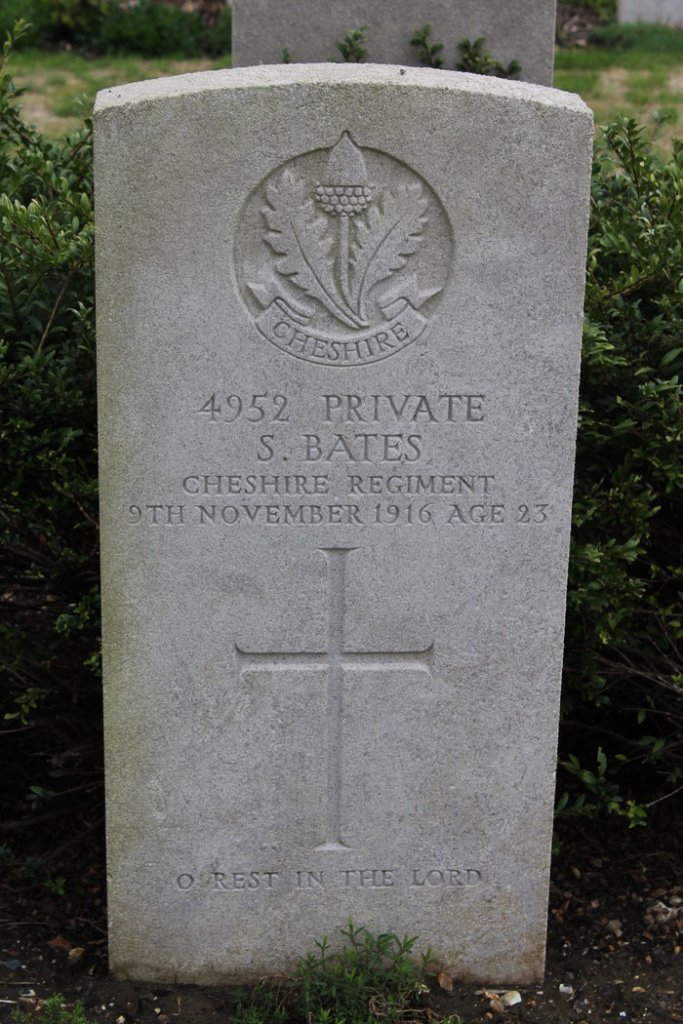 9/11/1916 Private Stanley Bates (Age 23) 6th Bn. St. Sever Cemetery Extension, Rouen, Seine-Maritime France. ‘4952’ Son of Albert and Mary Jane Bates, of Mossley; husband of Florrie Bates, of 39, Andrew St., Mossley, Manchester. (pic from findagrave.com – with thanks)