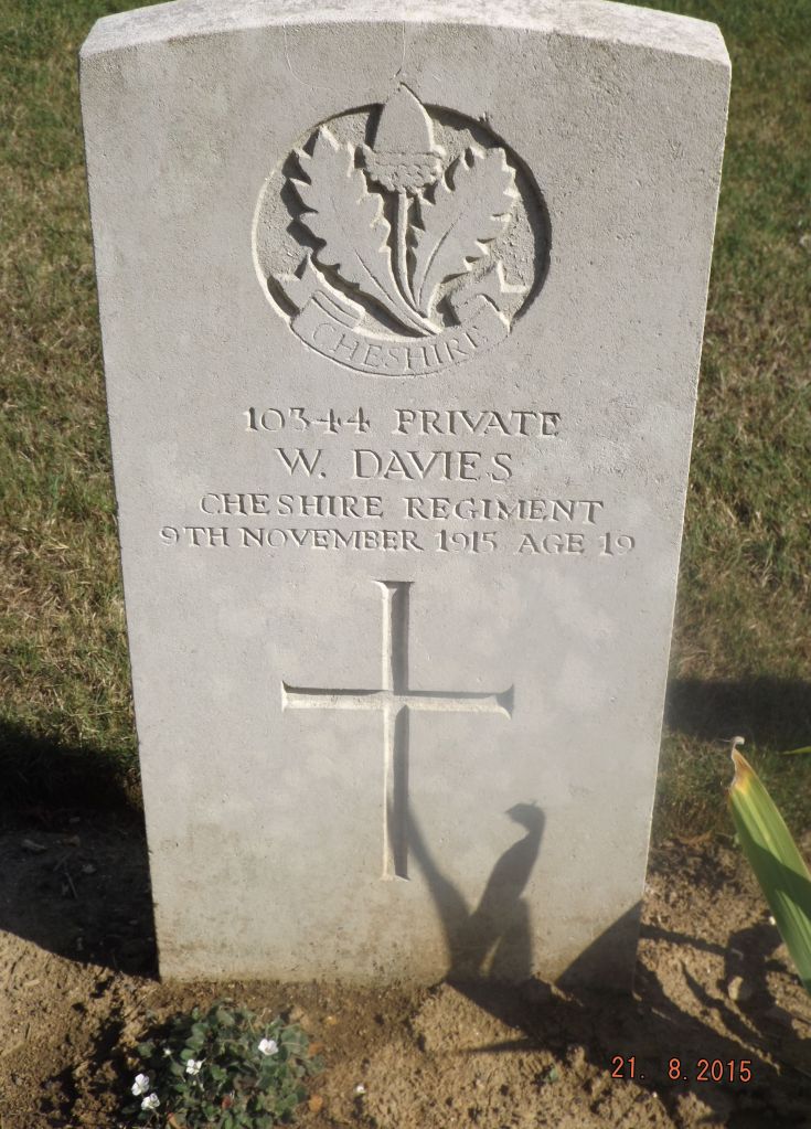 9/11/1915 Private William Davies (Age 19) 1st Bn. Citadel New Military Cemetery, Fricourt, Somme France. ‘10344’ Son of William and Mary Davies, of 6, Victoria Cottages, Mill Lane, Macclesfield. (pic from findagrave.com – with thanks)