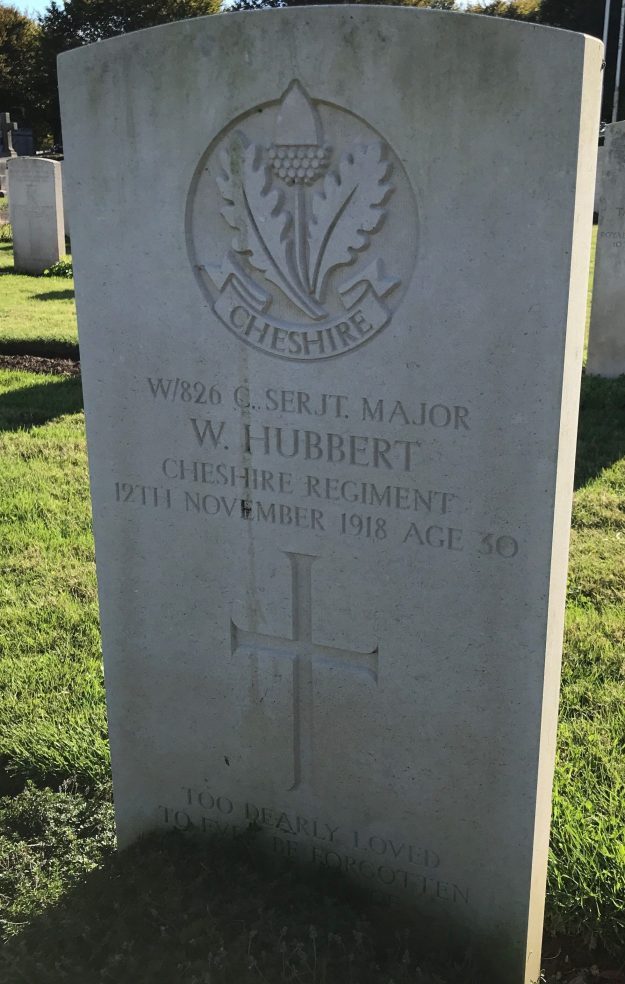 12/11/1918 Company Serjeant Major William Hubbert (Age 30) 13th Bn. Janval Cemetery, Dieppe, Seine-Maritime France. ‘493’ Husband of Florence Hubbert, of 4, White Row, Bromborough, Birkenhead. (pic from findagrave.com – with thanks)