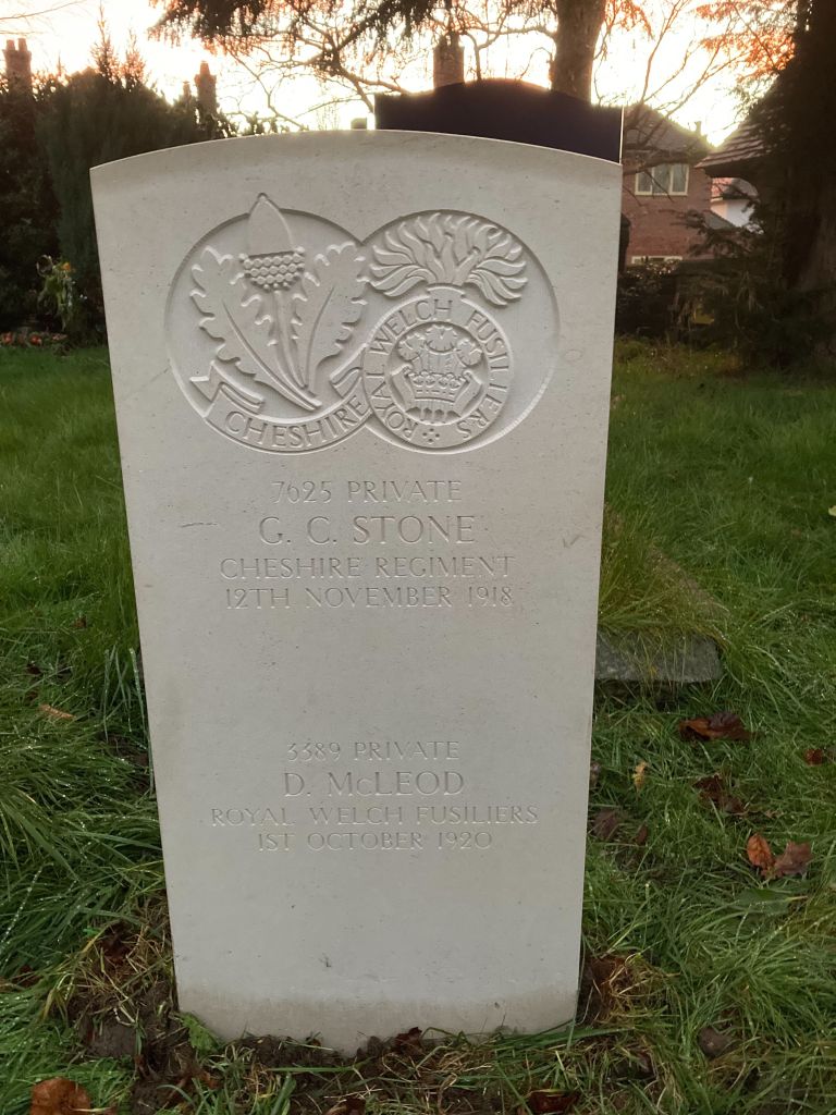 12/11/1918 Private George (Charles) Stone 2nd Bn. ‘7625’ South. 254. Upton (Holy Ascension) Churchyard, Cheshire, United Kingdom. (pic from findagrave.com – with thanks)