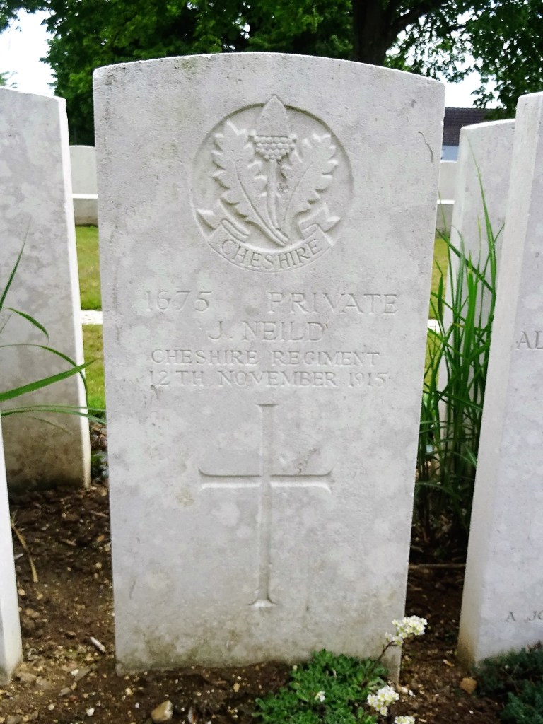 12/11/1915 Private Joseph Neild 5th Bn. Corbie Communal Cemetery, Somme France. ‘1675’ (pic from findagrave.com – with thanks)