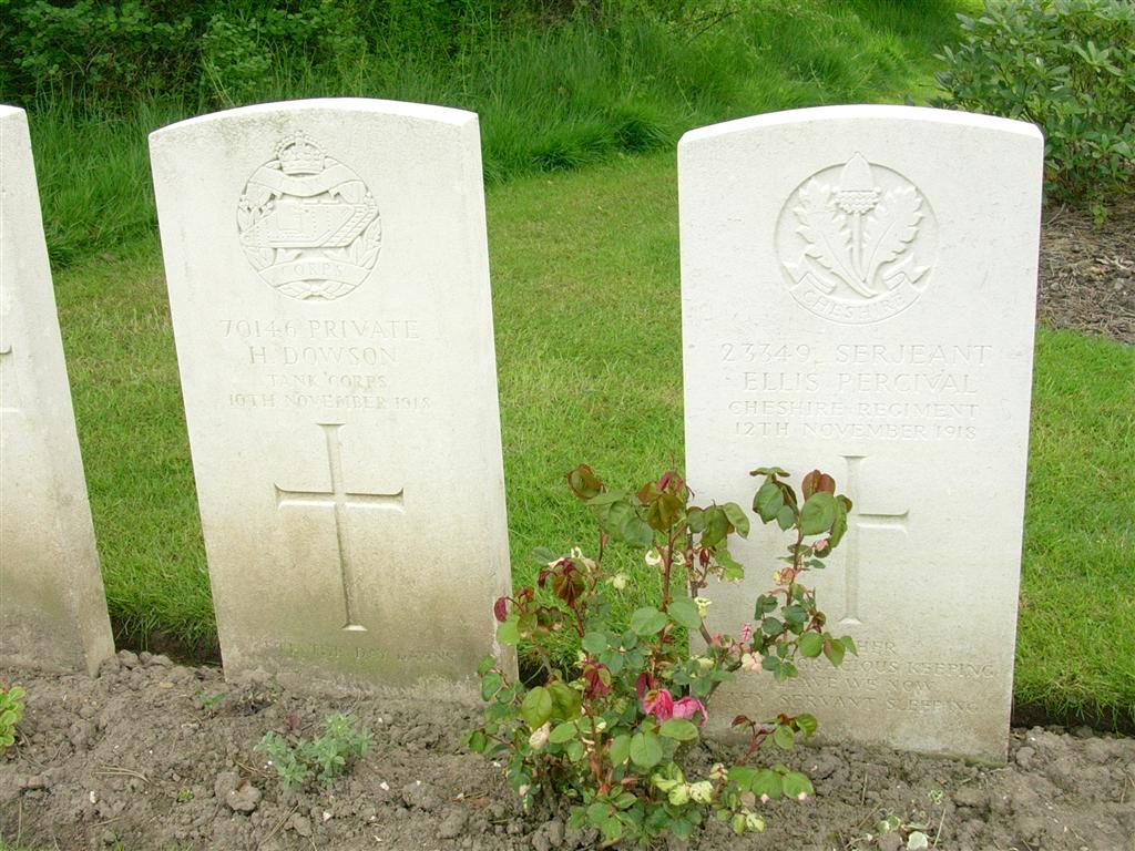 12/11/1918 Serjeant Ellis Percival (Age 21) “C” Coy. 9th Bn. Etaples Military Cemetery, Pas de Calais France. ‘23349’ Son of Charles and Martha Eleanor Percival, of Ellesmere Port, Cheshire. (pic from findagrave.com – with thanks)