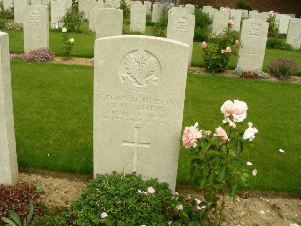14/11/1916 Second Lieutenant Roger Mortimer Baskett (Age 21) 14th Bn. attd. 16th Bn. Faubourg D’amiens Cemetery, Arras, Pas de Calais France. Son of Bertram G. M. and Gertrude Baskett, of Caradon, Rayleigh, Essex. (pic from findagrave.com – with thanks)