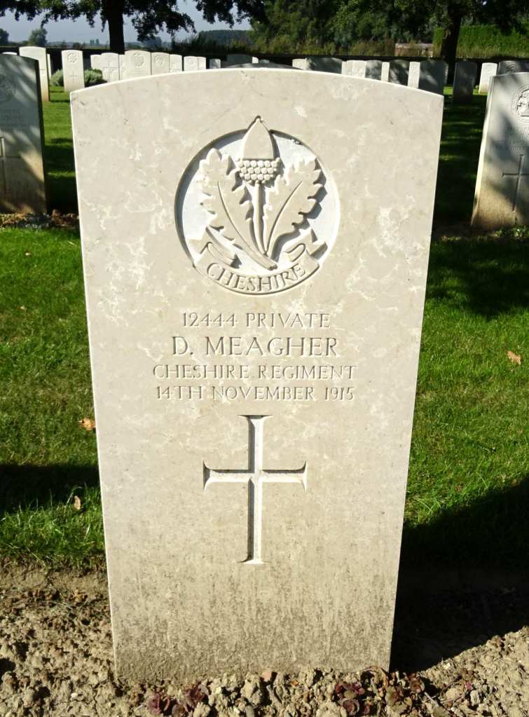 14/11/1915 Private Dominic Meagher 9th Bn. Le Touret Military Cemetery, Richebourg-L’avoue, Pas de Calais France. ‘12444’ (pic from findagrave.com – with thanks)
