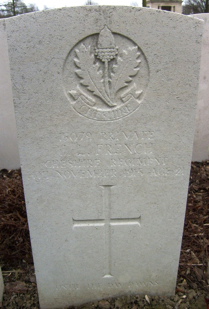 14/11/1915 Private James Levi French (Age 21) 10th Bn. Bailleul Communal Cemetery Extension, Nord, Nord France. ‘15079’ Son of James French; husband of Annie Ireland (formerly French), of 37, Cawdor St., Runcorn, Cheshire. (pic from findagrave.com – with thanks)