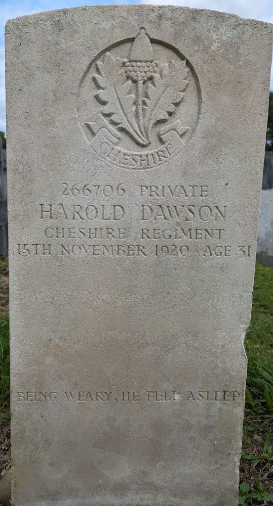 15/11/1920 Private Harold Dawson (Age 31) 3rd/6th Bn. Hale Cemetery, Cheshire United Kingdom. ‘266706’ Husband of Jane Dawson, of Moss Lane, Altrincham. (pic from findagrave.com – with thanks)