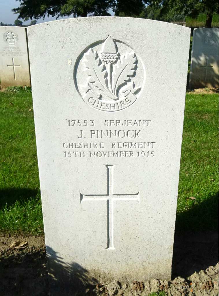 15/11/1915 Serjeant John Pinnock 9th Bn. Le Touret Military Cemetery, Richebourg-L’avoue, Pas de Calais France. ‘17553’ (pic from findagrave.com – with thanks)