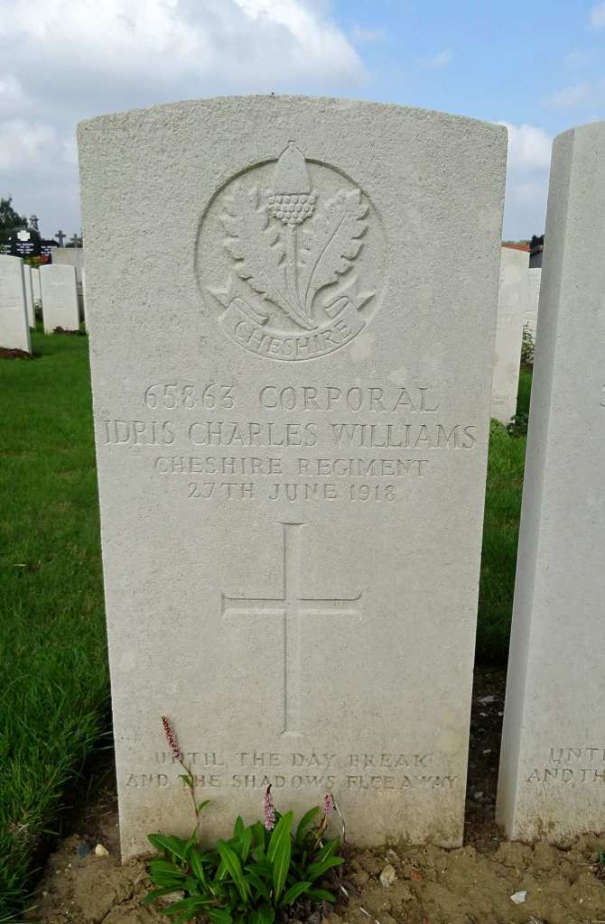27/06/1918 Corporal Idris Charles Williams (Age 19) 1st Bn. Aire Communal Cemetery, Pas de Calais France. ‘65863’ Son of the Rev. D. H. Williams, D.D., and Maggie Williams, of Lochfan Villa, Newport Mon. (pic from findagrave.com – with thanks)