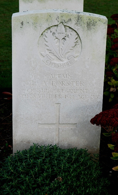 4/11/1914 Captain Lionel Archibald Forster (Age 35) 1st Bn. Douai Communal Cemetery, Nord France. Son of the Right Hon. William Forster, M.P., of Sydney, New South Wales, Australia; husband of Ione Toms (formerly Forster), of 1, Holmesgrove Rd., Westbury-on-Trym, Bristol. Served in the South African War. Born at Bamford Speke, Devon. (pic from findagrave.com – with thanks)