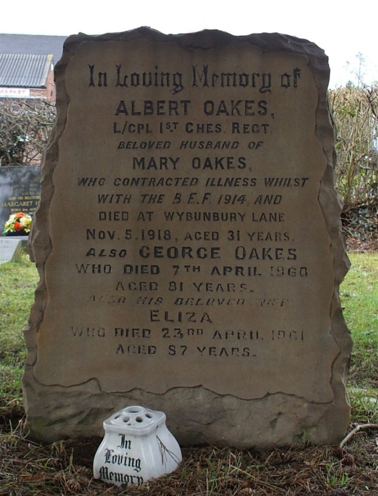 5/11/1918 Lance Corporal Albert Oakes 1st Bn. Wybunbury (St. Chad) Churchyard Extension, Cheshire United Kingdom. ‘7686’ (pic from findagrave.com – with thanks)